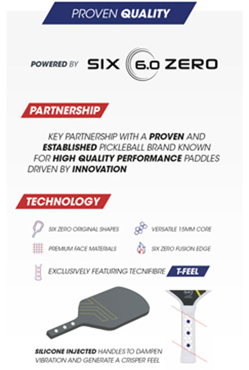 Inspired by the the Double Black Diamond Elongated, the Tecnifibre TF-Blitz pickleball paddle combines Six Zero’s quality construction boosted by the prominent Tecnifibre technology, and brought together with an attractive cosmetic. An overall length of 16.6 inches makes the Blitz the ideal paddle option for those who want the extra reach and power elongated shapes provide. In addition for players who like to roll their shots with lots of top spin, the narrower 7.4 inch paddle face of the Blitz definitely benefits that strategy. Six Zero’s mastery of Thermoformed Construction creates an ultra-durable paddle frame that is both a primary source of power and comfort.
